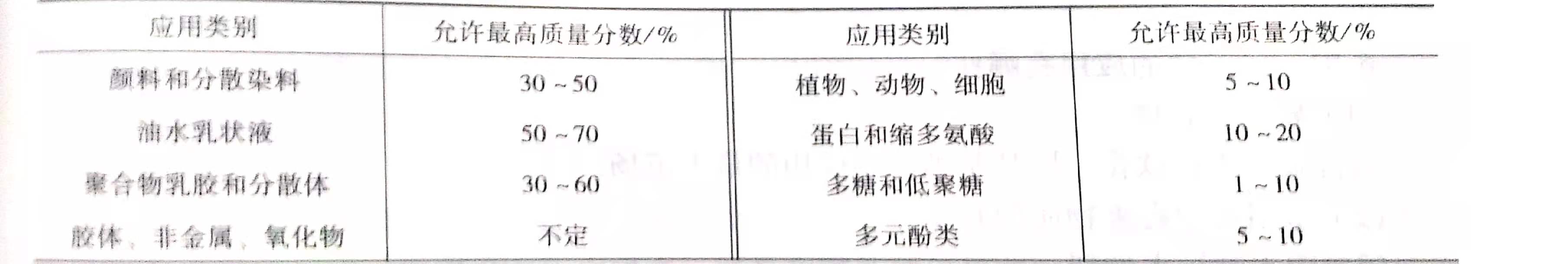 (6)隨著超濾過程的進(jìn)行,料液的濃度在增高,邊界層厚度擴(kuò)大,對超濾極為不利,因此對超濾過程主體液流的濃度應(yīng)有一個限制,即最高允許濃度。不同料液超濾時的最高允許濃度見下表。